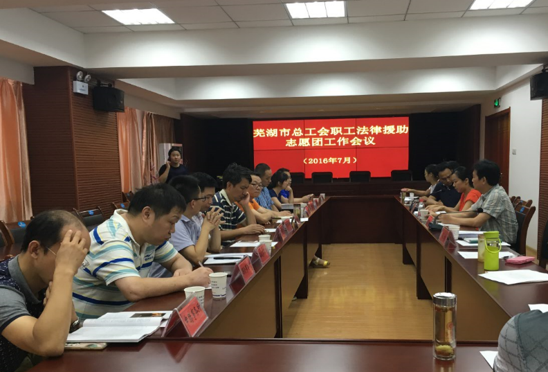 2016年7月29日下午三点,芜湖市总工会职工法律援助志愿团工作会议在芜湖市总工会会议室召开,市总工会王欣部长主持此次会议,安徽纬纶律师事务所古立平主任、谭啸律师、卢海霞等律师参加了此次工作会议。