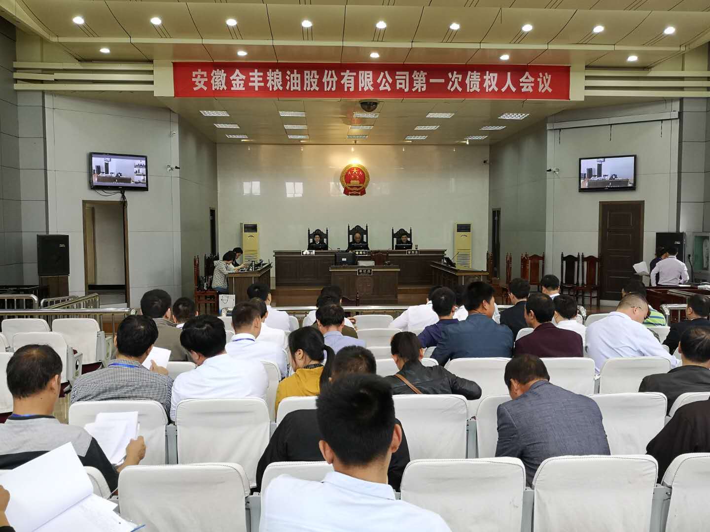 安徽金丰粮油股份有限公司破产清算案于2018年5月11日上午在繁昌县人民法院第一法庭召开第一次债权人会议,本所作为管理人向债权人会议作如下报告和建议:《管理人执行职务的阶段性报告》、《提请债权人会议核查债权的报告》《债务人财产状况的报告》、《债务人财产管理方案的报告》、《管理人报酬的报告》、《管理人下一步工作计划的报告》。本次会议在繁昌县人民法院的主持下,按照法定程序完成第一次债权人会议各项工作。审判长表示破产清算是让陷入困境的企业重生的法律制度,目的是更大范围内保护债权人利益,希望通过各方特别是债权人的努力和支持,能够完成破产清算方案。