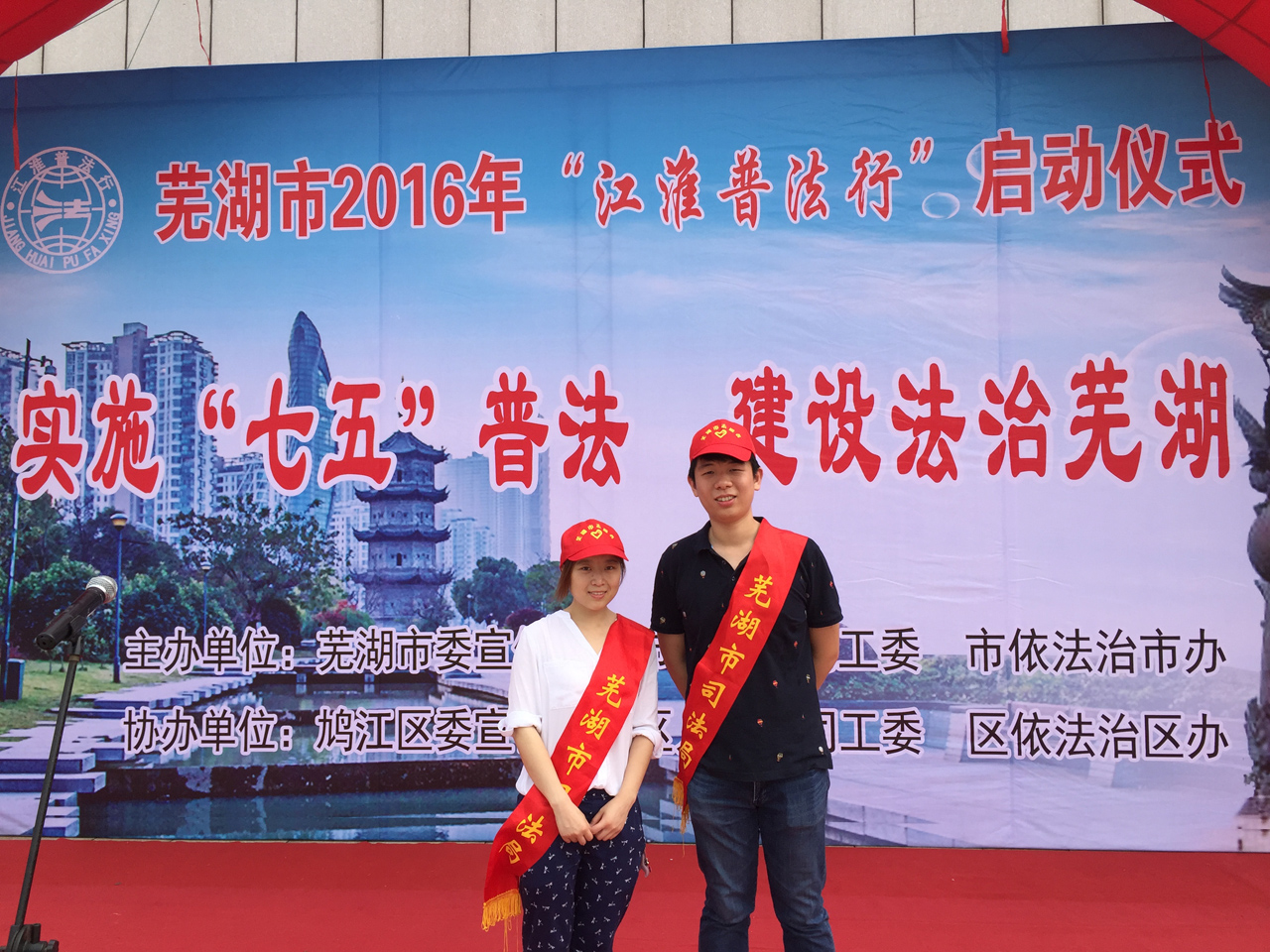 2016年8月5日,我市司法局联合芜湖市中院及其他市政机关单位在政务新区广场开展“江淮普法行”大型普法活动。我所谢晋驰律师、肖亚男律师作为志愿者参加了该活动。