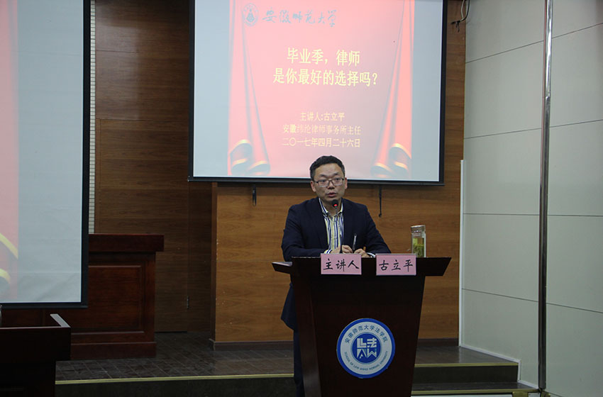 2017年4月26日下午,我所古立平主任受安徽师范大学法学院邀请参加了“安师大法学院-律师事务所合作洽谈会”,并为法学院学子开展了“毕业季,律师是你最好的选择吗?”专题讲座。