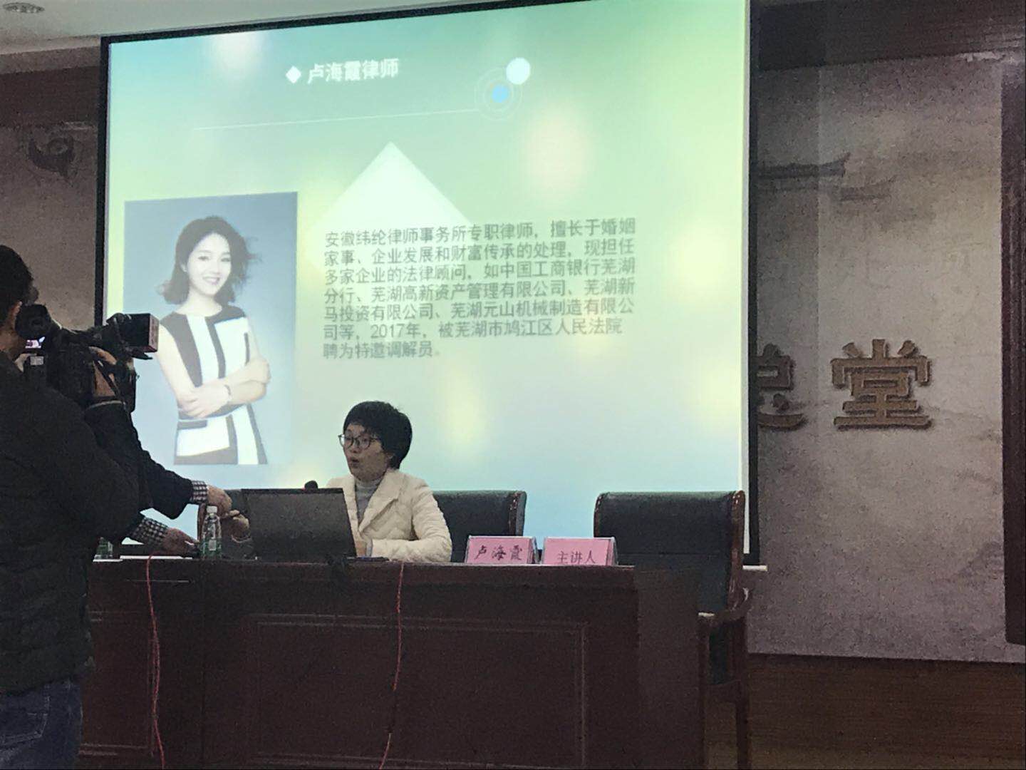 会上,卢海霞律师获得了“镜湖区家庭维权律师巾帼志愿服务队”荣誉称号。此外,卢律师针对生活中常见的夫妻共同财产、家庭暴力、问题婚姻等现象,把法律条文和身边案例结合起来,生动形象地给大家讲解化解家庭矛盾纠纷法律知识。