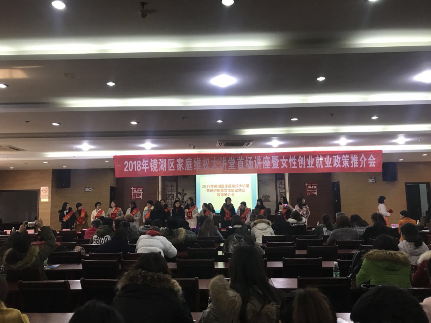 3月9日上午,镜湖区妇联联合区司法局、人社局在镜湖区文化馆3楼会议室举办2018年镜湖区家庭维权大讲堂首场讲座暨女性创业就业政策推介会,启动“家庭维权大讲堂”社区行主题活动。
