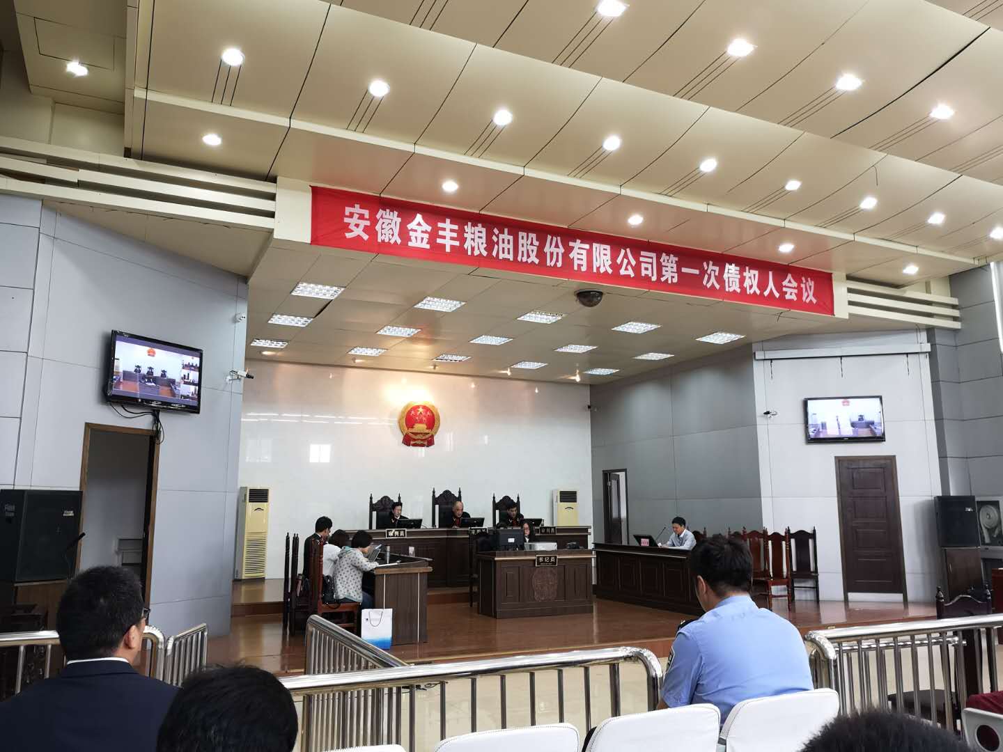 安徽金丰粮油股份有限公司破产清算案于2018年5月11日上午在繁昌县人民法院第一法庭召开第一次债权人会议,本所作为管理人向债权人会议作如下报告和建议:《管理人执行职务的阶段性报告》、《提请债权人会议核查债权的报告》《债务人财产状况的报告》、《债务人财产管理方案的报告》、《管理人报酬的报告》、《管理人下一步工作计划的报告》。本次会议在繁昌县人民法院的主持下,按照法定程序完成第一次债权人会议各项工作。审判长表示破产清算是让陷入困境的企业重生的法律制度,目的是更大范围内保护债权人利益,希望通过各方特别是债权人的努力和支持,能够完成破产清算方案。