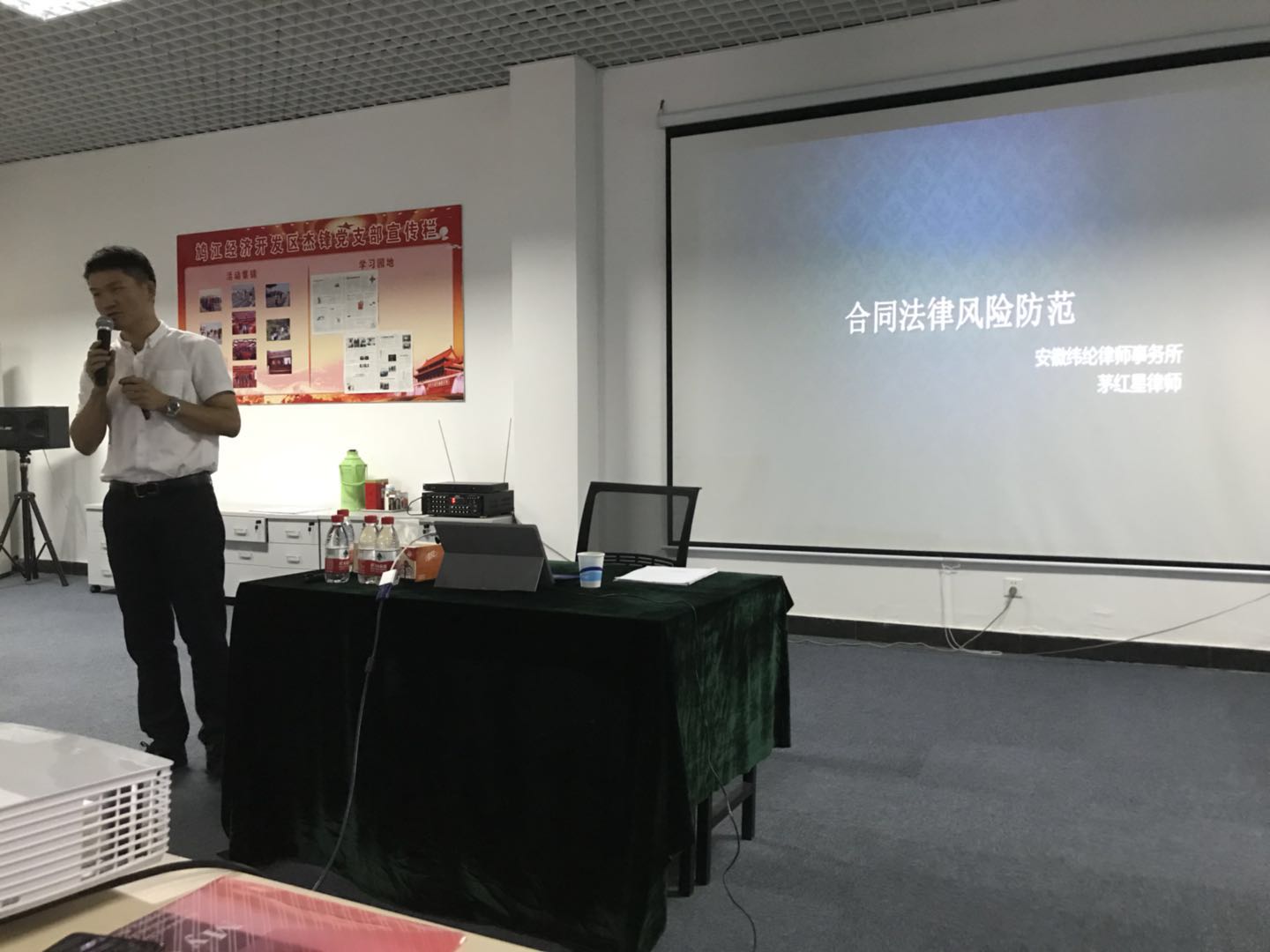 2018年5月18日,杰峰汽车公司开展《法律风险培训》,我所执行合伙人茅红星律师为本次培训作《合同法律风险防范》专题演讲。