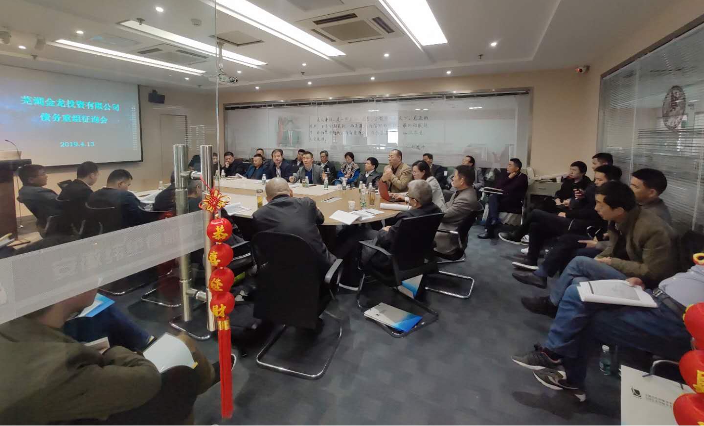 2019年4月13日下午1时整,芜湖金龙投资有限公司债务重组征询会于安徽纬纶律师事务所会议室顺利召开。安徽纬纶律师事务所陶新伯主任律师、毛海燕律师、钱玉洁律师,芜湖金龙投资有限公司任总、俞总及各位债权人均出席了会议。