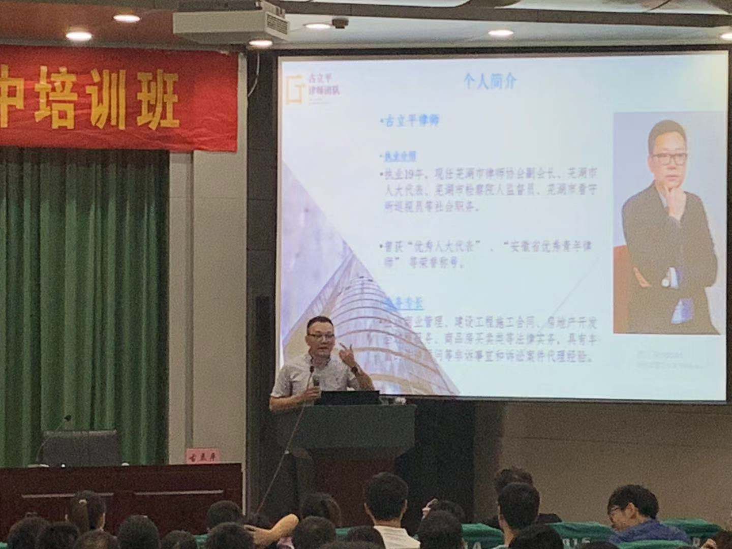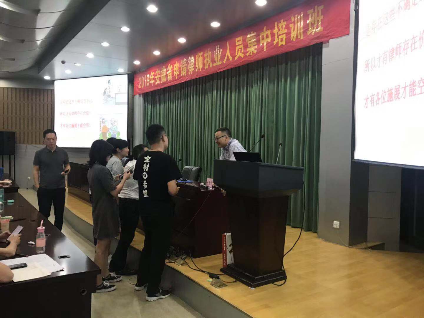 2019年8月13日下午,安徽纬纶律师事务所高级合伙人、芜湖市律师协会副会长、芜湖市人大代表古立平律师受邀前往安徽大学,为2019年安徽省申请律师执业人员集中培训授课。